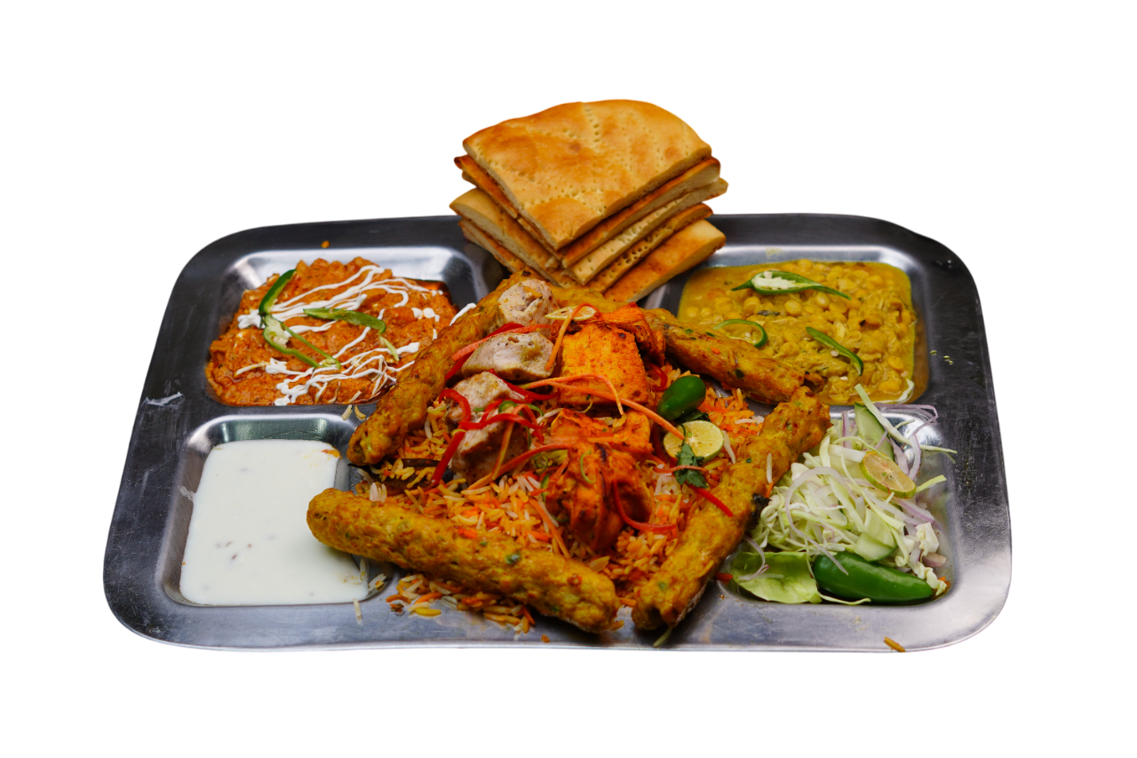 Birayani/ Pulao, Handi, 4 Malai Boti, 4 Seekh Kabbab, 4 Chatkara Boti Shahi Daal, Mint Sauce, Salad , & 4 Naan.